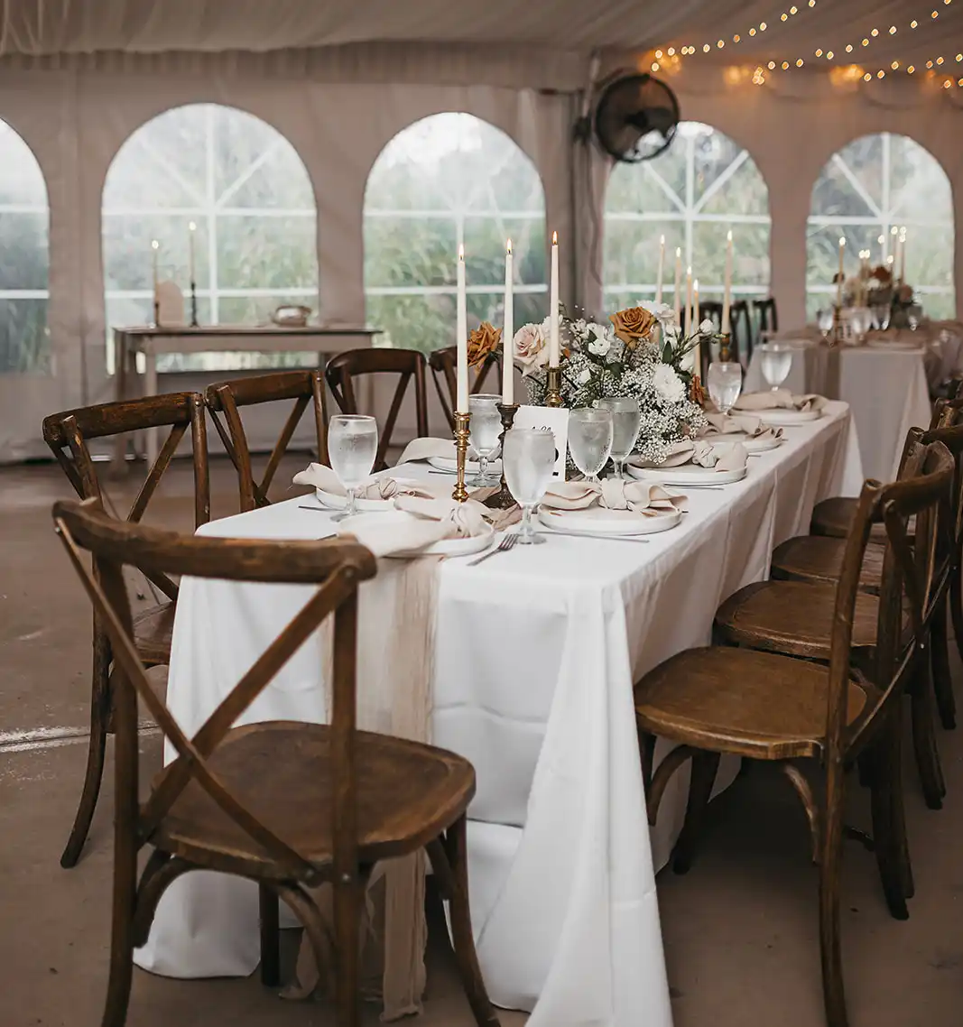 The Riverside Signature Package blends comfort, charm, and style to create the perfect atmosphere for gatherings of up to 100 people.